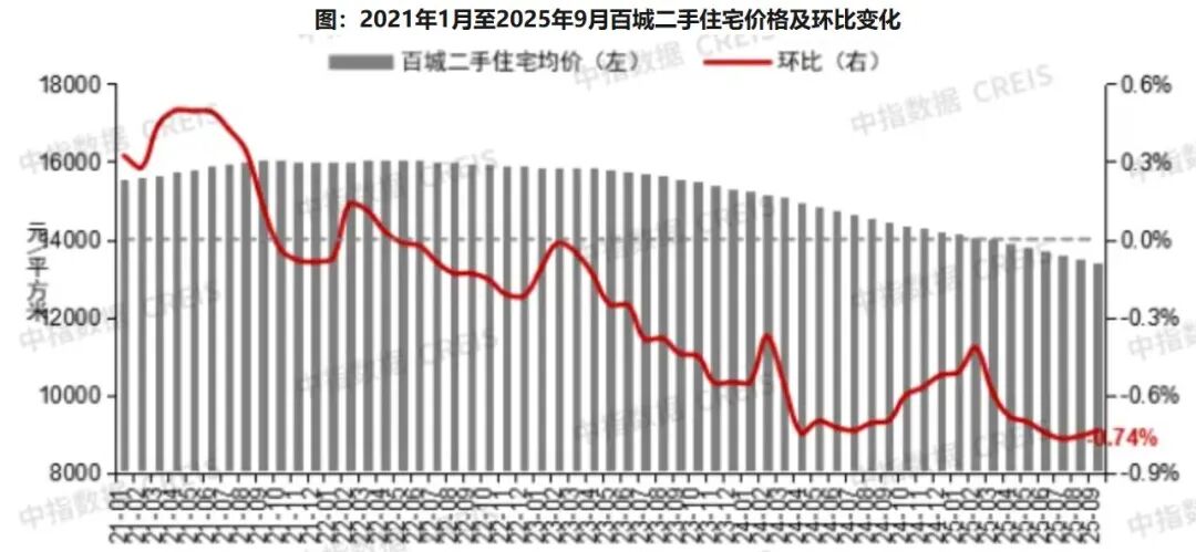 数据显示,9月百城二手住宅均价为13381元/平方米,环比下跌0.74%,同比下跌7.38%;第三季度,百城二手住宅价格累计下跌2.26%,跌幅较二季度扩大0.14个百分点;前三季度, 百城二手住宅价格累计下跌5.79%,市场调整幅度持续加深。