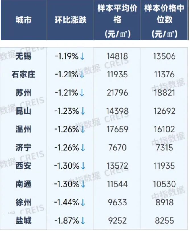 在二手住宅价格环比下跌的城市中,盐城(-1.87%)、徐州(-1.44%)、南通(-1.30%)、西安(-1.30%)、济宁(-1.26%)等城市环比跌幅靠前。
